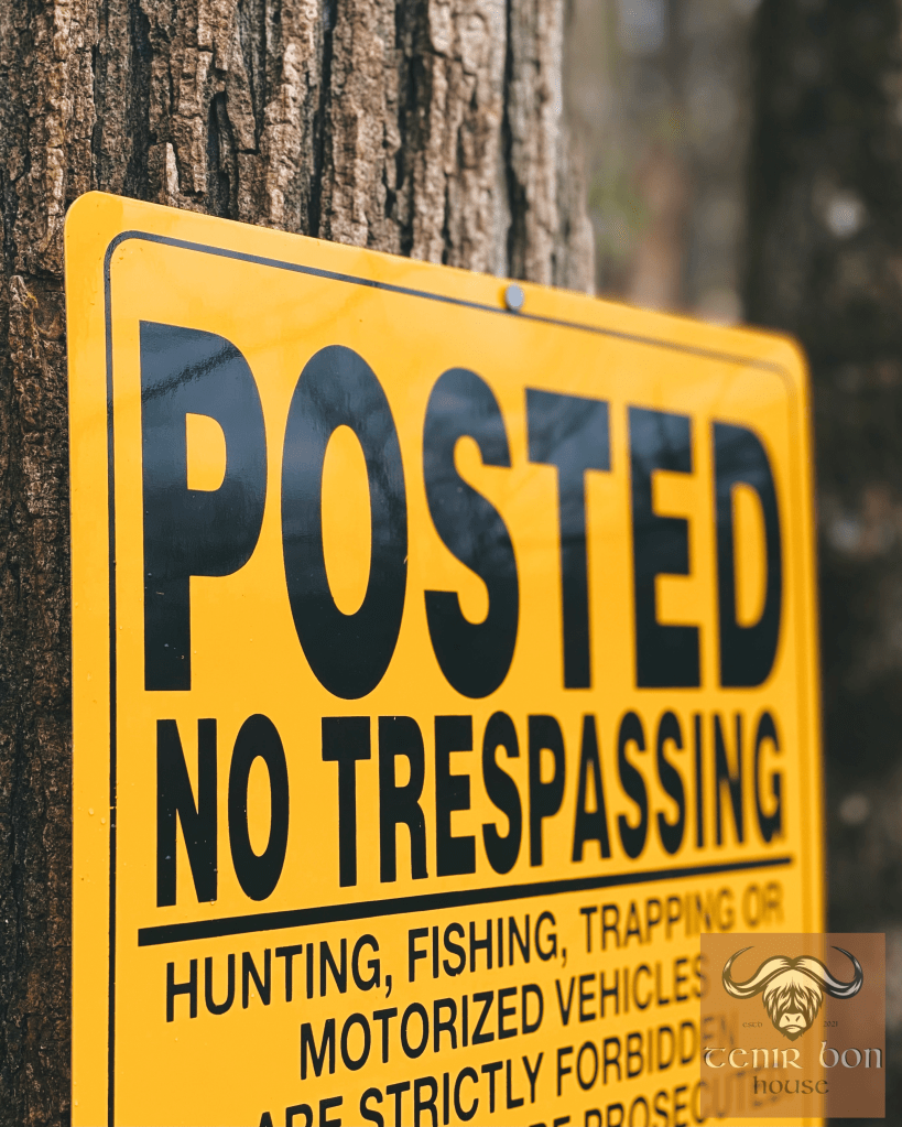 We ordered our signs from a Veteran owned custom sign company that preprinted our name and address on metal; this will last much longer than typical signs you may find at your local hardware store. And with metal signs in one hand and a hammer in the other – we POSTED the road frontage boundary lines of TenirBon.